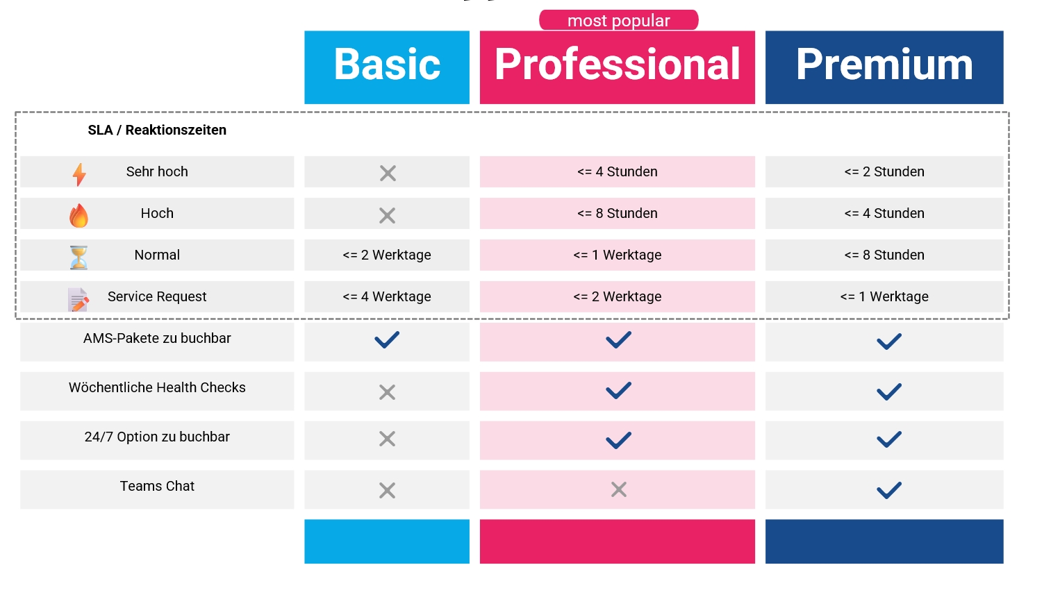 Wählen Sie zwischen Basic, Professional oder Premium – und entscheiden Sie selbst, wie intensiv wir Sie begleiten. Von der soliden Basis mit Zugrif auf unser Ticketsystem bis zum 24/7 Rundum-Support: Mit unserem SAP GTS Support sind Sie auf der sicheren Seite.
